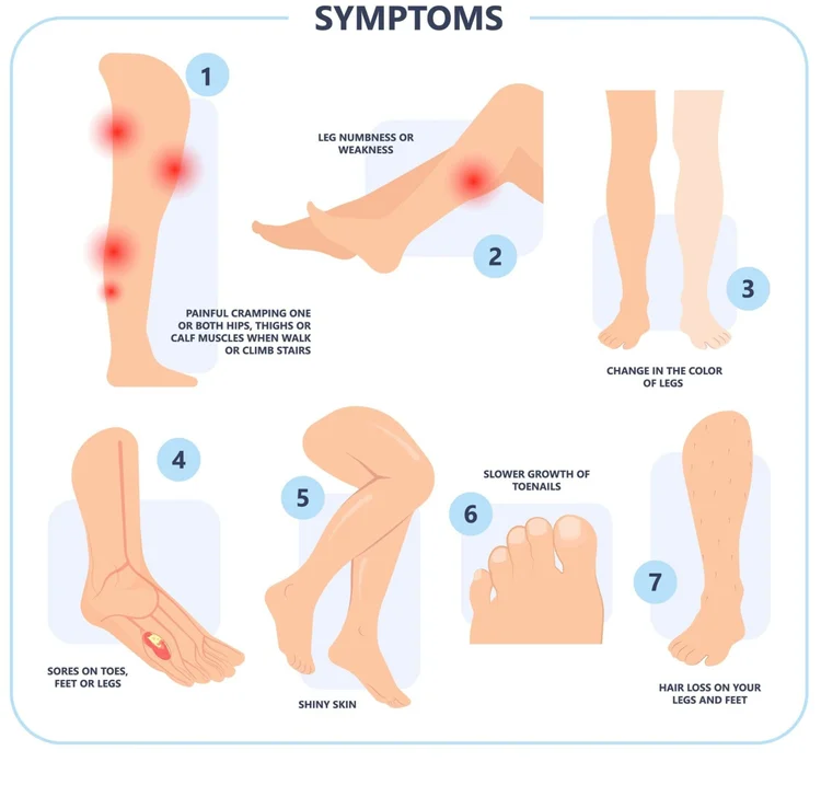 Less specific symptoms like shinny skin, slower growth of toenails and hair loss on legs and feet.